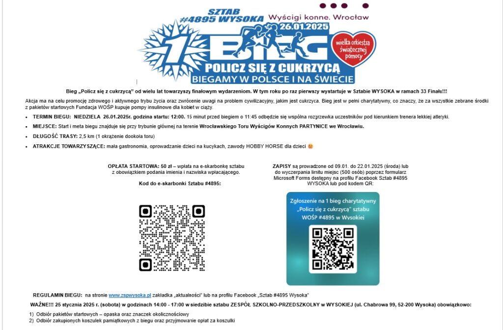 Bieg charytatywny “Policz się z cukrzycą” to wydarzenie, które łączy aktywność fizyczną z niesieniem pomocy. Każdy zakupiony pakiet startowy to realne wsparcie dla Wielkiej Orkiestry Świątecznej Pomocy, która od lat pomaga osobom potrzebującym, finansując specjalistyczny sprzęt medyczny.