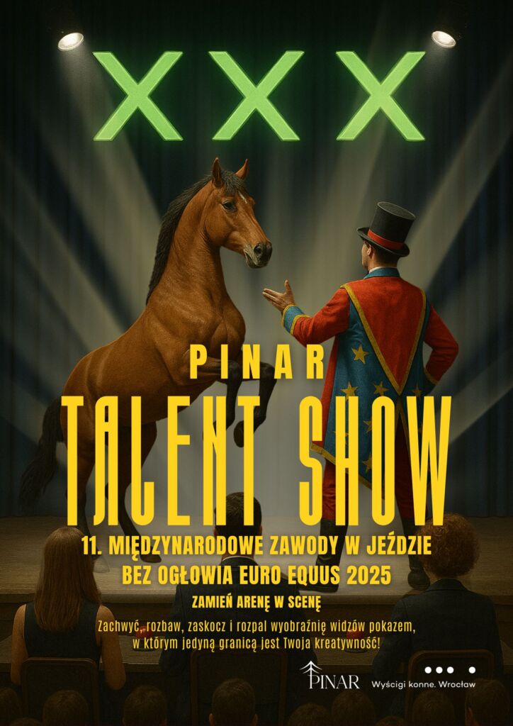 Zapraszamy do udziału w pierwszej edycji PINAR Talent Show podczas Zawodów Bez Ogłowia! To wyjątkowa okazja, by zaprezentować swoje umiejętności, kreatywność i pasję w pracy z końmi przed publicznością i jury. Talent Show odbędzie się 21 września 2025 r. w krytej ujeżdżalni WTWK–Partynice. Organizatorem wydarzenia jest Wrocławski Tor Wyścigów Konnych – Partynice przy współpracy ze Stajnią Ardena (Gałów).