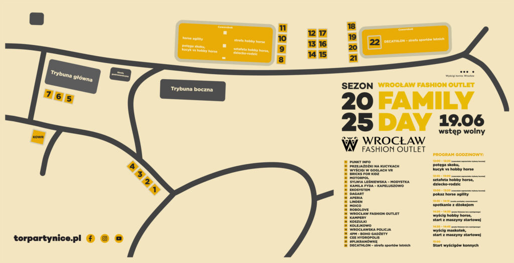Tego dnia zapraszamy na Wrocław Fashion Outlet Family Day – nowość na torze Partynice, która zamieni wyścigowe popołudnie w pełne radości święto dla całych rodzin. W programie znajdą się m.in. wyścig Hobby Horse ze startem z prawdziwej maszyny startowej, emocjonująca sztafeta dziecko–rodzic, pokaz potęgi skoku w wykonaniu sportowych koni, a także widowiskowe horse agility, które pokaże, jak wiele można osiągnąć z koniem bez ogłowia i siodła. Ponadto zwiedzanie stajni rekreacyjnej z instruktorem. Zakup biletów online jest dostępny do 24 godzin przed wydarzeniem. W dniu wydarzenia bilety będzie można zakupić, w ramach dostępności miejsc, na stoisku z kucykami. KUP BILET