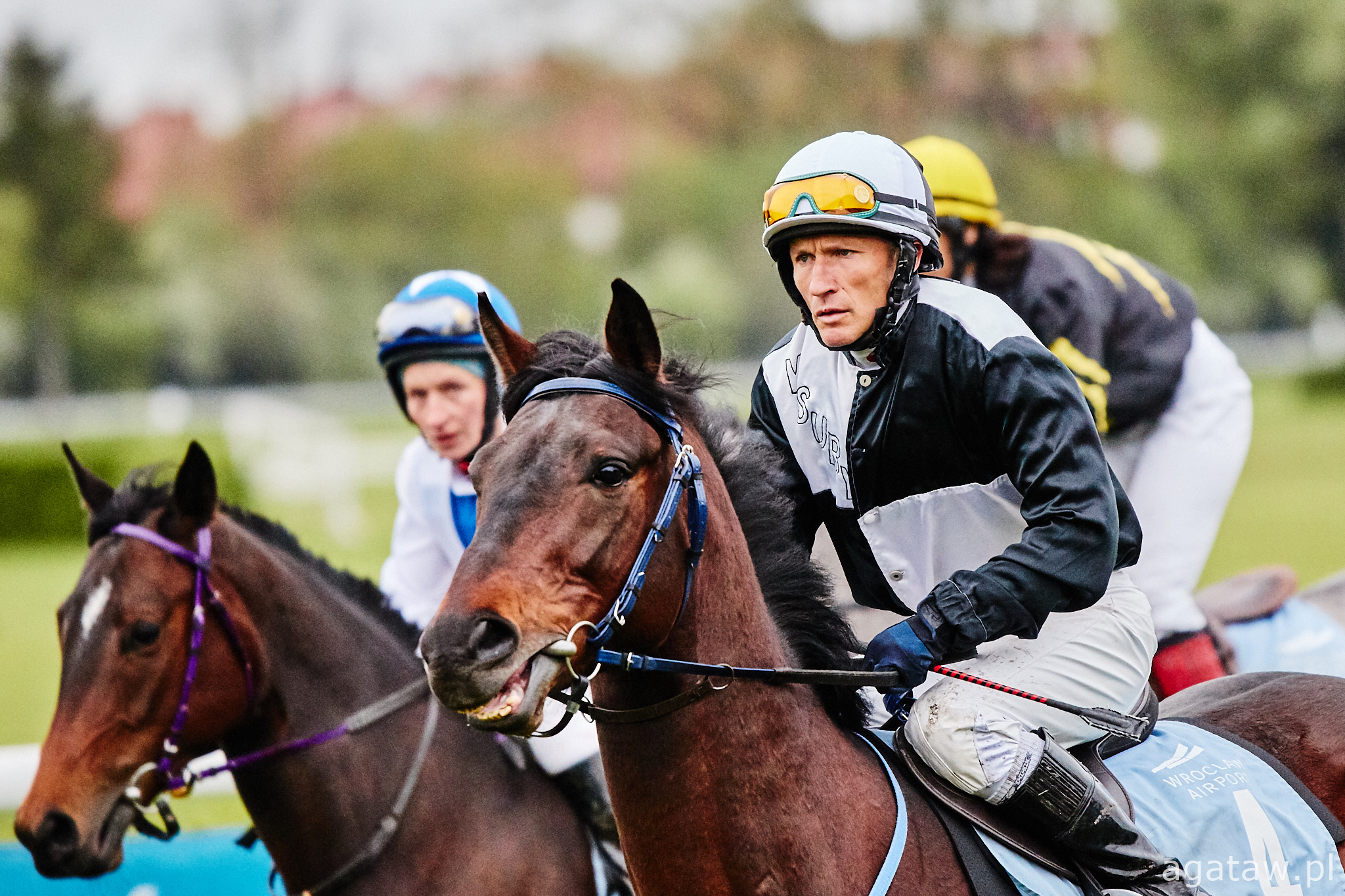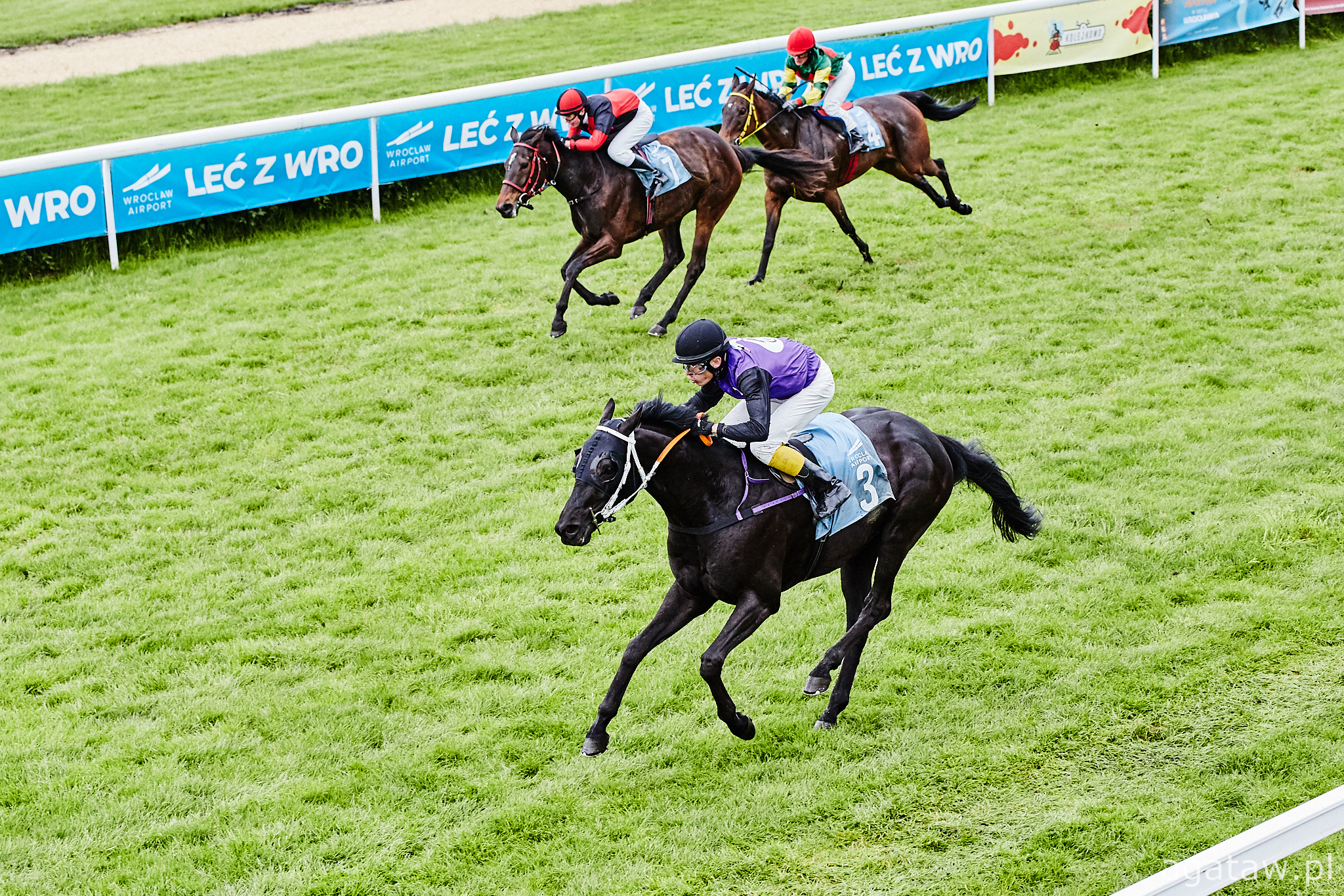 Trzecia gonitwa, to debiutujące trzyletnie konie pełnej krwi angielskiej – od początku w czołówce galopowały faworyzowane Jam Vladyslava pod Natalią Hendzel i Trybunał, którego dosiadał gościnnie młody szwedzki jeździec Andreas Tapia Dalbark. Na prostej klacz uzyskała przewagę nad rywalem i niezagrożona minęła celownik jako pierwsza, trzeci finiszował Mlody Pan (Petro Nakoniechnyi). Trenerem zwyciężczyni jest Wojciech Chaboski.